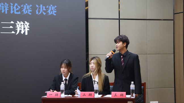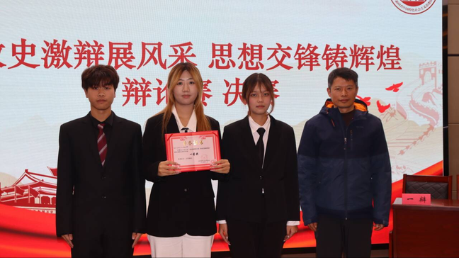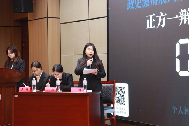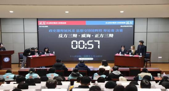 经过多轮激烈角逐,两支队伍对“社会秩序维持主要靠法律”“社会秩序维持主要靠道德”等辩题充分展开分析。比赛中,正方以历史的深度为刃,剖析政策演变;反方则借政治的高度为旗,解读历史走向。从开篇立论的条理分明,到攻辩环节的步步紧逼;从自由辩论的高潮迭起,到总结陈词的画龙点睛,双方各展其能,将思辨之美展现得淋漓尽致。“ 以史为鉴知兴替,以政为纲明方向 ”,他们旁征博引,或援引经典史籍,或列举时政要闻,为观众带来一场知识与逻辑交融的盛宴。