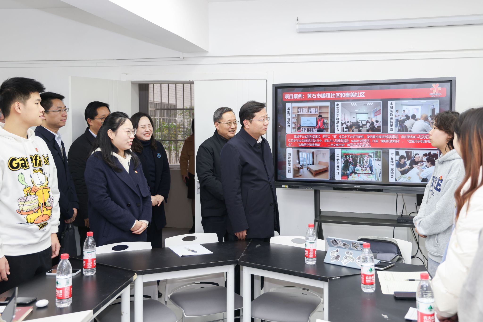 周森锋一行来到经济与管理学院“一站式”团学服务站,详细了解基层团组织“青年之家”“团学代表联络站”“社区服务岗”等服务阵地建设和运行情况,关心“挑战杯”竞赛团队备赛进度。