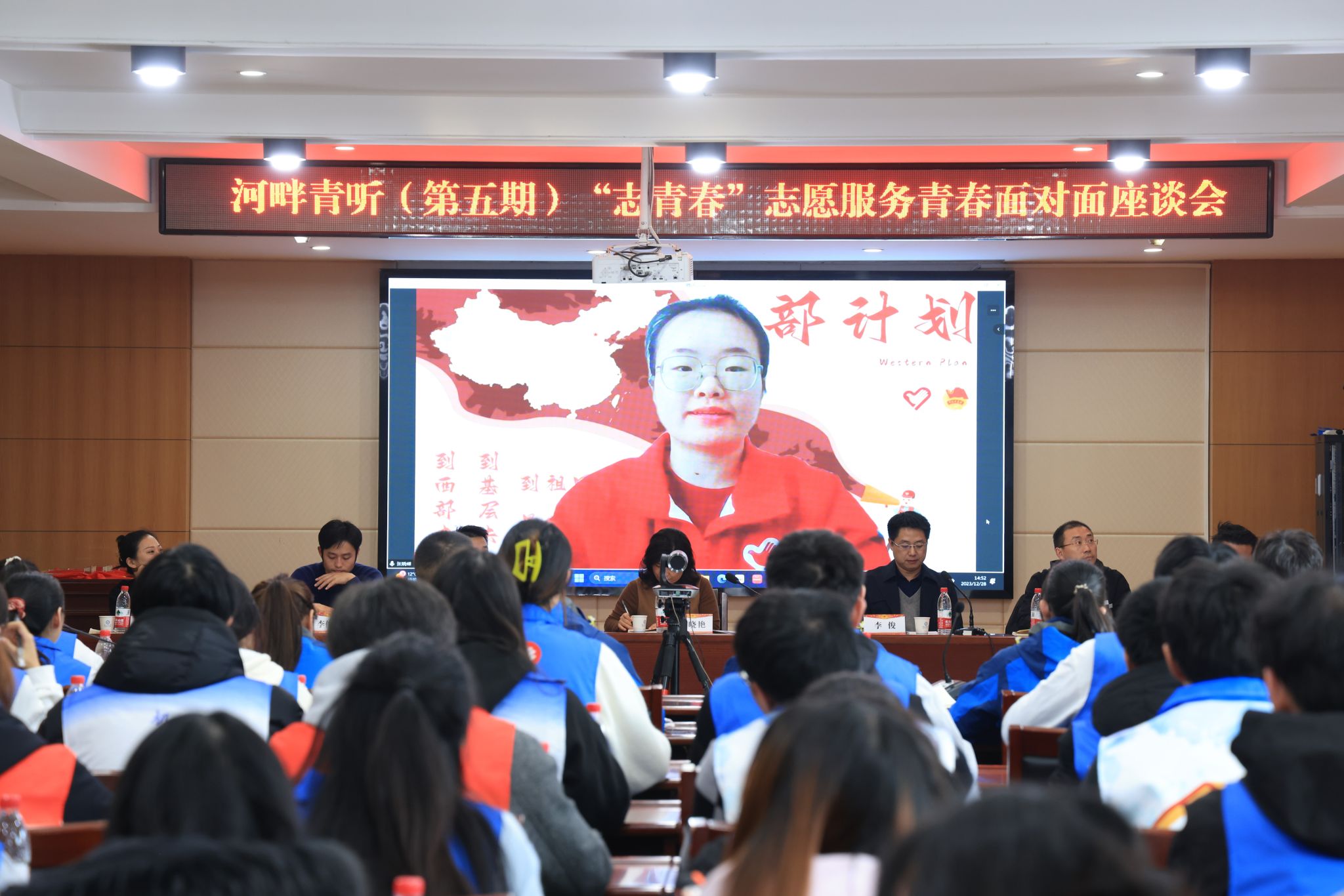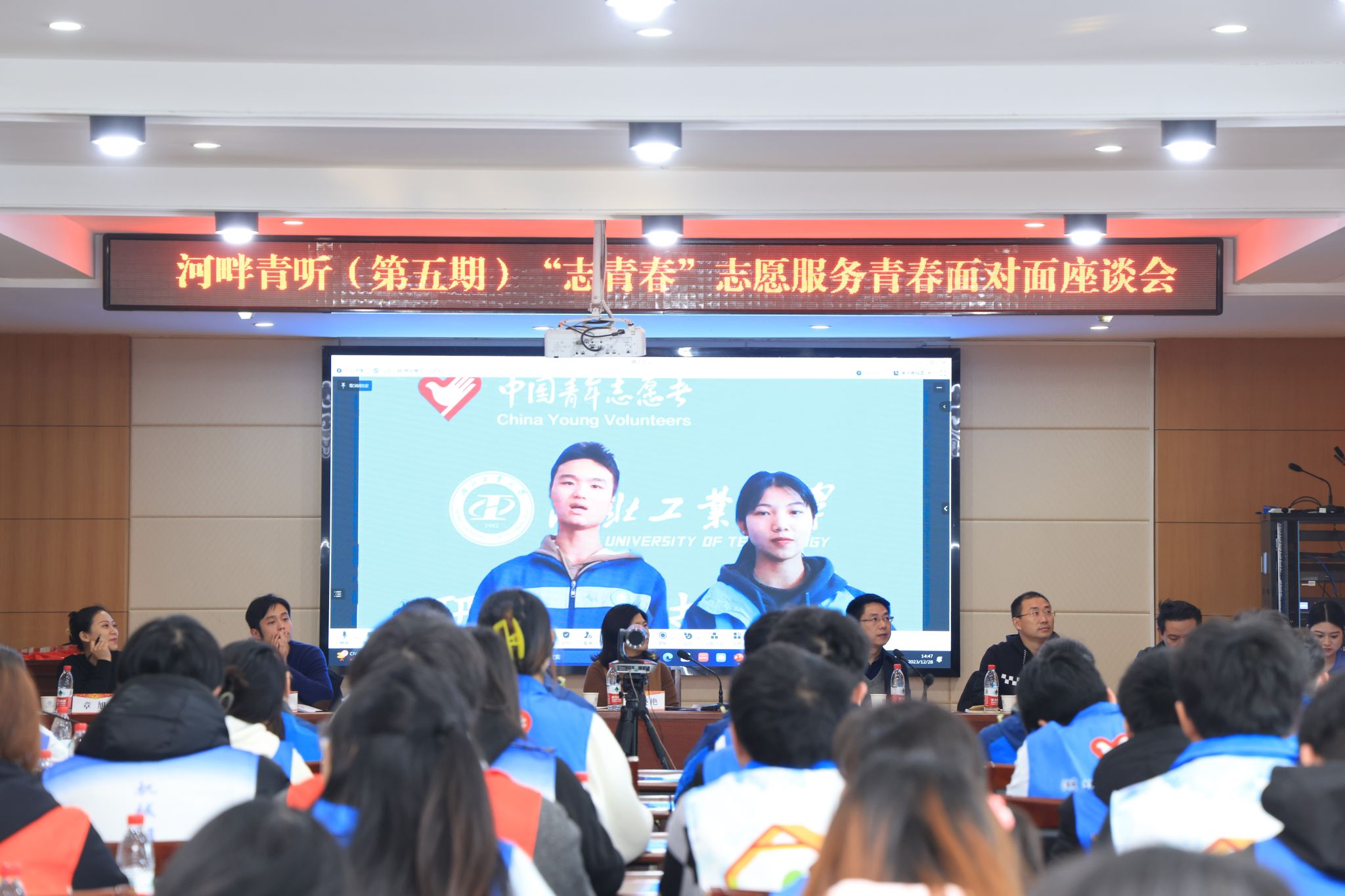 12月28日下午,学校举行“河畔青听·志青春”志愿服务青春面对面座谈会,座谈会采用线上线下相结合的形式进行,校党委副书记胡晓艳与广大青年志愿者畅谈志愿精神,共话青春担当。