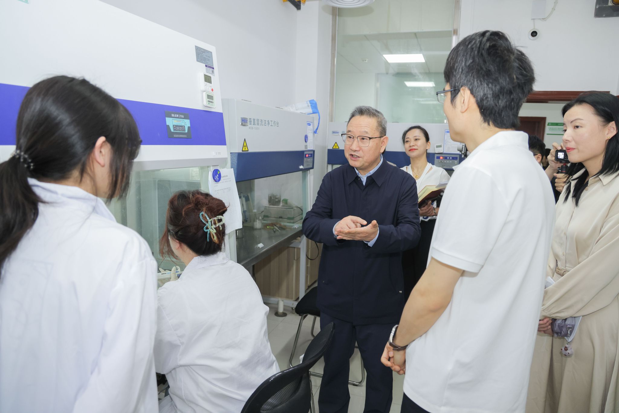 在生命科学与健康工程学院,彭育园详细了解学校食品营养与健康青科突击队面向食源致病菌防控技术开展靶向攻关的最新成果。彭育园指出,青科突击队要充分发挥科创攻关的示范效能,开展有组织的科研,推动科研成果的高效转化,引领凝聚青年师生聚焦湖北省“51020”现代产业集群开展科研攻关,为实现高水平科技自立自强注入青春动能。