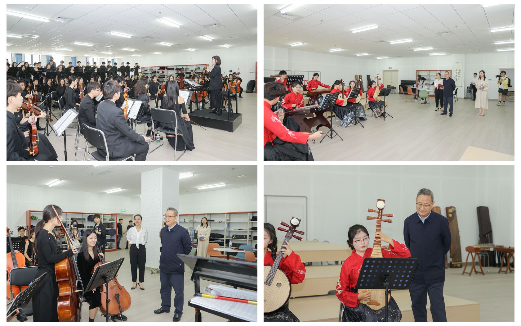 在双创大楼艺术教育中心,大学生艺术团正在组织排练。彭育园认真观看了管弦乐团、民乐团、合唱团的表演,并看望慰问了正在为校园舞蹈大赛排练的生命学院、工设学院文工团的同学们,详细了解艺术教育和高水平艺术团建设情况。彭育园强调,要进一步结合工科院校特点,推进校园美育浸润赋能人才培养,打造具有湖工大特色的美育育人模式,提升学生的文化自信、美育素养和审美自觉,引导湖工大青年追求更有高度、更有境界、更有品位的人生。