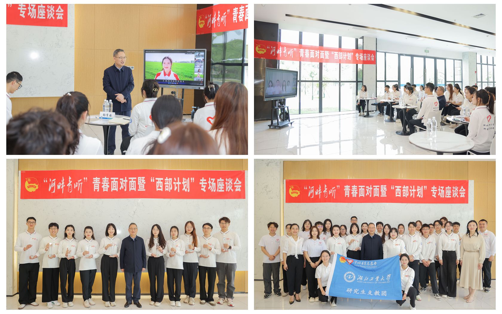 在双创大楼C座一楼大厅,学校“河畔青听”青春面对面暨“西部计划”专场座谈会正在举行。彭育园来到青年志愿者中间,通过线上形式看望慰问正在新疆、云南、广西等西部地区开展支教服务的第六届研究生支教团成员,与往届研究生支教团成员代表座谈交流,并为第五届研究生支教团代表颁发纪念奖杯。彭育园表示,研究生支教团是学校实践育人工作的特色品牌,涌现出一批优秀青年典型,希望研支团的同学们发挥示范引领作用,带动更多青年学生上好“行走的思政课”和“一线的专业课”,在火热的社会实践中增长才干、成为栋梁。