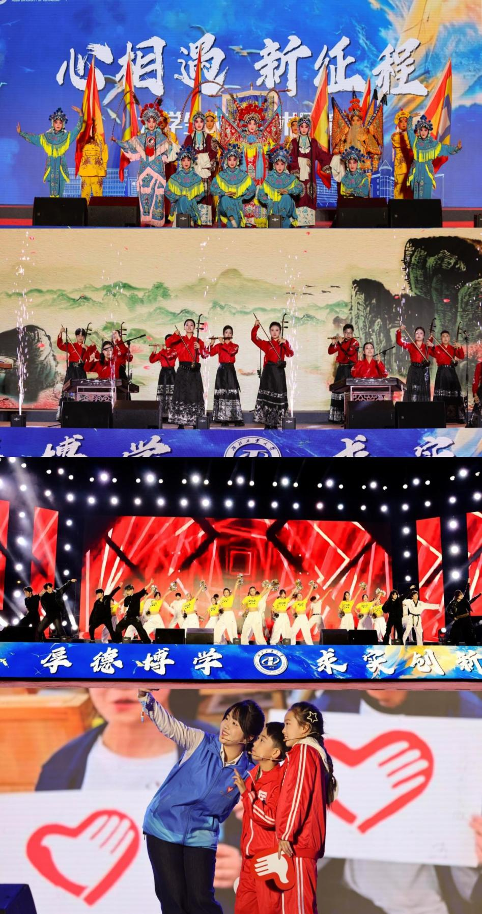 戏曲表演《爱国志士·京韵风华》结合刀马旦的飒爽、老生的豪迈和青衣的温婉,诠释了古今仁人志士矢志爱国报国的坚定信念;学校音韵国乐社的同学们用民乐与现代电声交融的形式演奏了民乐《国韵新声》,用音乐架起连接现代和传统的桥梁;舞蹈串烧《舞力全开》用动感青春的表演点燃现场氛围,焕发出青年学子向上生长的蓬勃朝气;情景表演《薪火暖书山》生动再现了学校爱心助学社20余年坚守支教初心,潜心志愿服务,让青春之花绽放在基层一线的感人瞬间。