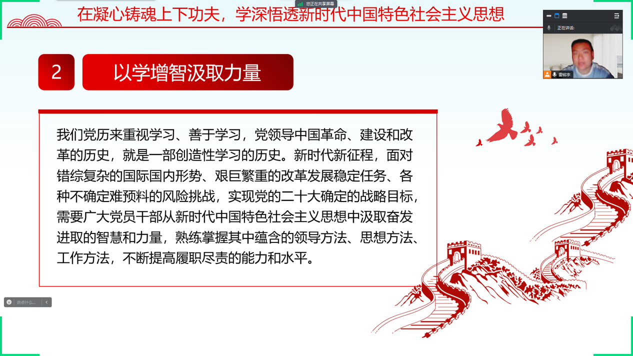 此次读书会活动采取集中研学和分享交流相结合的方式。会上,由第四届研支团成员、2023级马克思主义学院研究生雷铭宇领学习近平新时代中国特色社会主义思想相关内容,大家集体学习、认真聆听,及时记录下了重点内容。学习结束后,研究生支教团成员们围绕学习内容,并结合自身经历,进行了交流研讨发言,畅谈自己的所获、所思、所想、所悟。