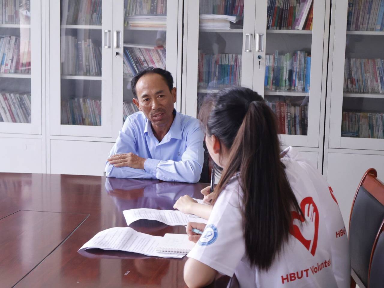 图为实践队员在当地党员服务中心采访毛泽湘。