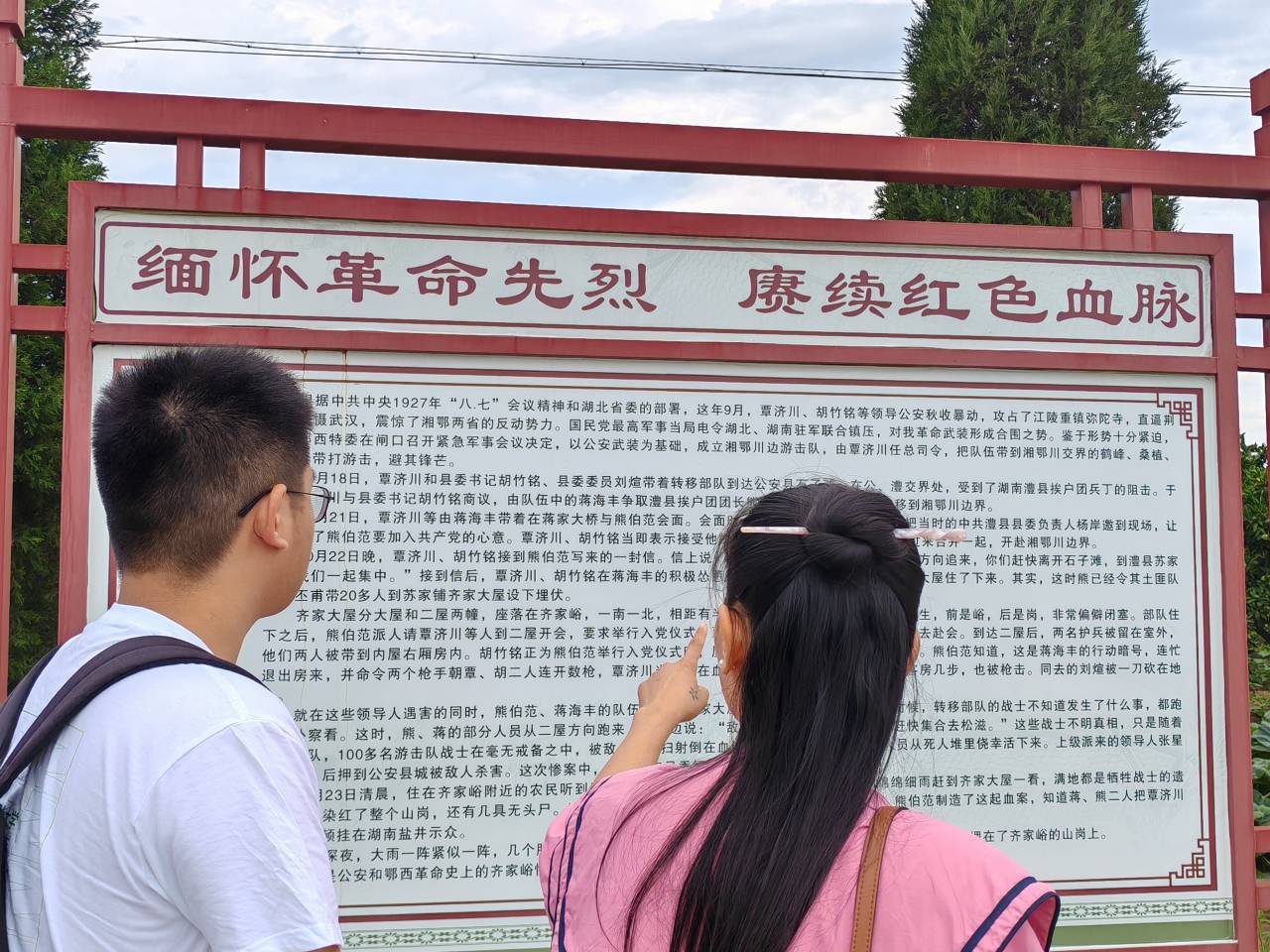 日前,实践队员来到覃济川烈士陵园,瞻仰革命先烈。公安县章庄铺镇松林村的赵海燕老师进行引导解说。