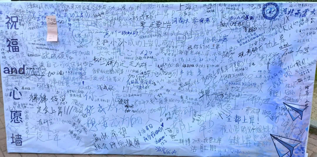寒冬出征,暖意融融,为鼓舞考研学子的士气,校学生会同时与二级学院学生会联动,征集学弟学妹们手写的祝福卡片。在寒冷的冬日,为考研学子送上“一研为定”礼包,包含发热贴、蒸汽眼罩、书签、手写祝福卡片。这些祝福卡片中表达了学弟学妹们对考研学长学姐的深情祝福。同时在摆点处设立上岸板,每位路过的考研学子都写下了他们对于未来的美好期盼,进一步增强考研学子的信心。