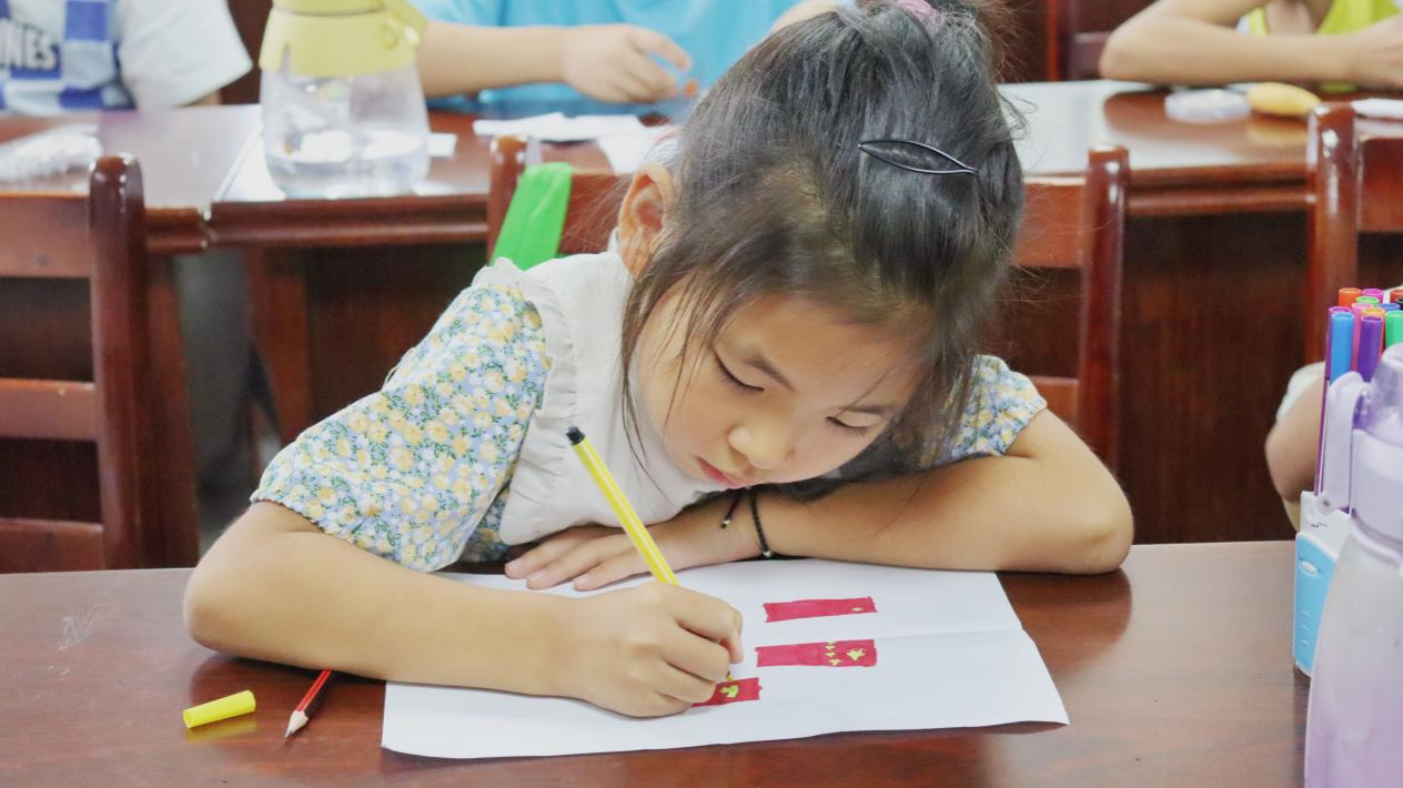 五星闪耀映天穹,国旗飘扬展雄风。志愿者以国旗知识为切入点,为当地孩子们带来了生动有趣的红色文化课堂。“红是热血的颜色,黄是光明的象征。”志愿者用温柔而坚定的声音,将国旗的每一个细节化作生动的故事,讲述着五星红旗背后的革命历程与深刻含义。孩子们挺直身板,或凝神聆听,或低头沉思,仿佛能透过这面旗帜,看到那些为了新中国浴血奋战的先烈们。讲解中,志愿者们还鼓励孩子们亲手绘制国旗,用手中的画笔描绘心中的爱国情。小小的画纸上,每一笔都显得那么认真而郑重,那是孩子们对祖国的深情告白,是对革命先辈的由衷敬仰,也是对未来的美好憧憬。一笔一划绘国旗,童心共筑中国梦。在这一刻,爱国不再是一个宏大的命题,而是化作了孩子们手中挥舞的画笔、纸上跃动的色彩,心中涌动的暖流。